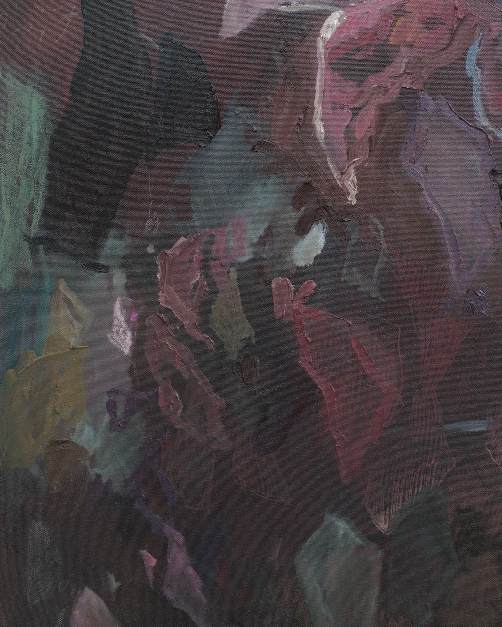 Acrylic, oil, chalk pastel, oil pastel, graphite and ink on unprimed canvas in a handmade pine floater frame